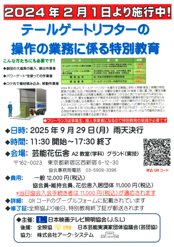 テールゲートリフター特別教育が9月29日に新宿・芸能花伝舎にて開催されます。